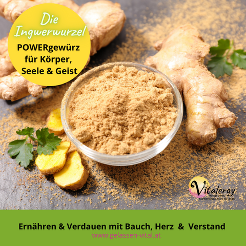 Ingwer fördert die Bildung dieser subtilen Essenz, denn er trägt das Prinzip des Lichtes und der Wärme in sich und begünstigt bewusste Wahrnehmung, Klarheit und spirituelles Wachstum. Diese Essenz ist die Voraussetzung für die Bildung und Ausschüttung von Endorphinen, den sogenannten Glückshormonen.