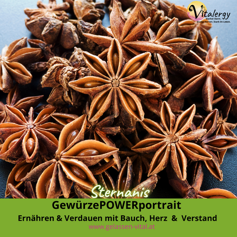 Sternanis (Illicium verum) schätzt man in der Traditionellen Chinesischen Medizin schon seit 5000 Jahren. Er ist aromatisch, wärmt und stärkt die Nieren. Außerdem wirkt er antibakteriell, verdauungsfördernd, schleimlösend, von innen erwärmend. Er erinnert geschmacklich an Anis, ist allerdings etwas voller und würziger, auch leicht scharf. Er eignet sich auch hervorragend für Teegebäck oder verfeinert Tees, Glühwein oder Grog. Aber auch in Kompotten, Mus, Rotkraut, Kürbis und vor allem in der indischen Küche findet er Verwendung.