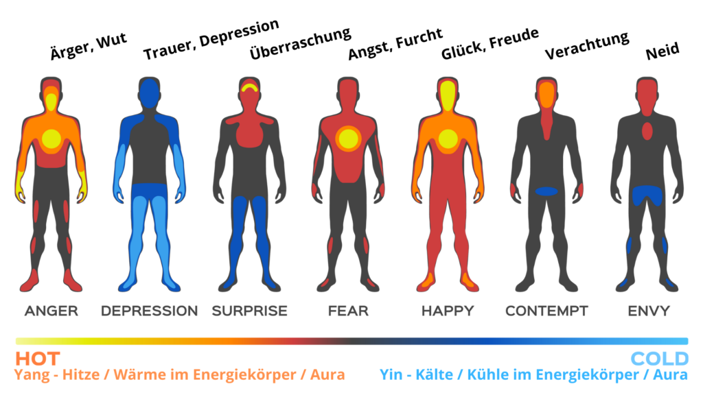 Dieses Bild zeigt, wo im Körper sich energetisch betrachtet Wärme oder Kälte zeigt, wenn wir uns in einem emotionalen Zustand befinden. Auch auf unserer Zunge kann der erfahrende TCM-Therapeut Hitze, Kälte, Trockenheit, Feuchtigkeit, aber auch Gefühlszustände ablesen.